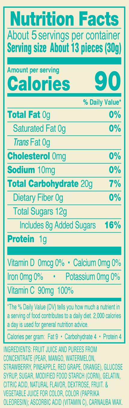 From your favorite beverage to your next healthier snack time staple. AriZona Fruit Snacks gives you 100% real fruit, packed with Vitamin C and only 90 calories per serving in the perfect little package. Enjoy Fruit Punch, Mucho Mango, Grapeade, Orangeade and Watermelon in this bite-size, fat free, gluten free, preservative free and 100% guilt free treat!