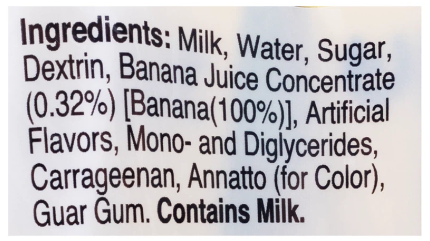 Milk, water, sugar, dextrin, banana juice, concentrate (.32%) [Banana (100%)], artifiical flavors, mono-and diglycerides, carrageenan, annatto (for color), and guar gum.