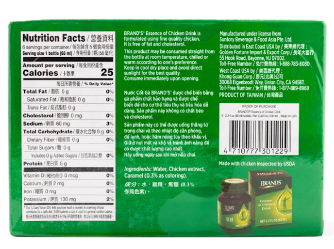 Brand's® Chicken Essence is composed of amino acids and peptides. Amino acids and peptides form small protein molecules that help promote nerve conduction, thereby improving concentration and memory, activating brain function and overall health, and enhancing mental performance.
