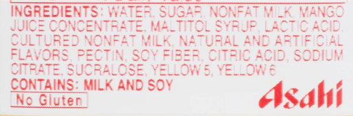 Ingredients: Water, sugar, nonfat dry milk (treated with a lactic acid culture), mango juice concentrate, lactic acid, pectin, natural and artificial flavors, soy fiber, citric acid, sodium citrate, FD&C yellow 5, FD&C yellow 6.
