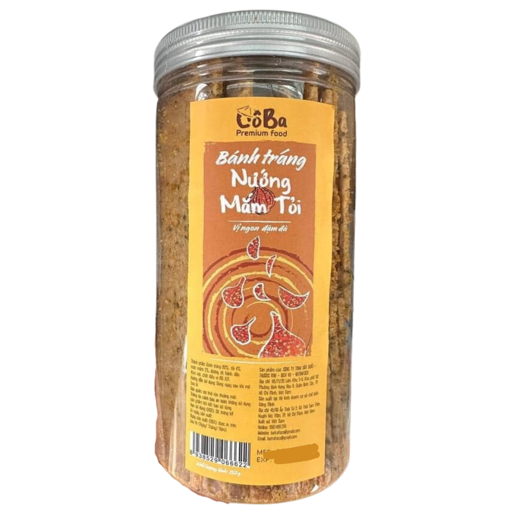 Co Ba Grilled Rice Paper With Fish Sauce And Garlic is a popular Vietnamese snack known for its bold flavors and crispy texture. It features thin, grilled rice paper seasoned with a savory combination of fish sauce, garlic, and other spices. This snack offers a harmonious balance of sweet, salty, and umami flavors with a hint of smokiness from the grilling process. It's a convenient and flavorful treat, often enjoyed on its own or paired with beverages.