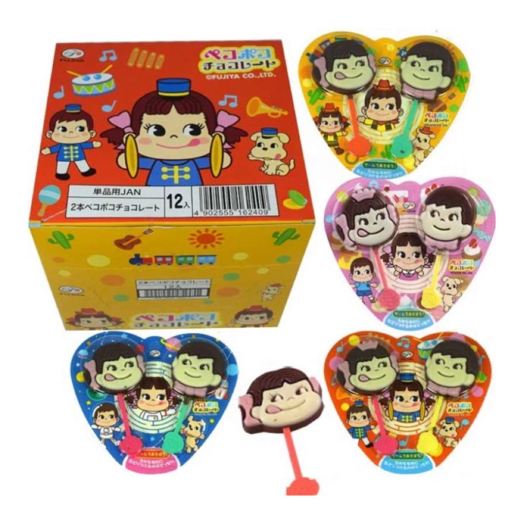 Fujiya Pekopoko Chocolate Lollipop is a fun, nostalgic Japanese treat featuring a chocolate lollipop shaped like Fujiya’s iconic mascot, Peko-chan. Each lollipop is crafted with rich, creamy milk chocolate, giving it a smooth, sweet taste that's loved by all ages. It has a playful design with Peko-chan’s cheerful face, making it popular not only for its taste but also for its cute appearance. The **Fujiya Pekopoko Chocolate Lollipop** is perfect for fans of Japanese confectionery looking to enjoy a whimsical snack with a dash of childhood nostalgia.