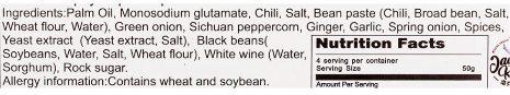 Ingredients: palm oil, monosodium glutamate, chili, salt, bean paste (chili, broad bean, salt, wheat flour, water), shallot, pepper, ginger, garlic, shallot, spice, yeast extract, black bean, white wine, rock sugar