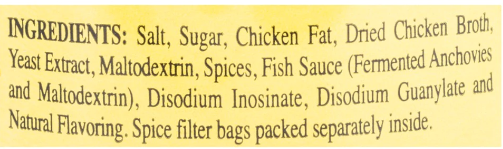 Ingredients: Salt, Sugar, Chicken Fat, Dried Chicken Broth, Dextrose, Yeast Extract, Fish Sauce (Fermented Anchovies and Maltodextrin), Spices, Disodium Inosinate and Disodium Guanylate. Spice filter bags are packed separately inside.