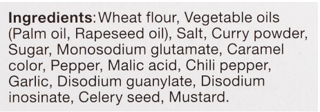 Wheat flour, Vegetable oils(Palm oil, Rapeseed oil), Salt, Curry powder,Sugar, Monosodium glutamate, Caramelcolor, Pepper, Malic acid, Chili pepper,Garlic, Disodium guanylate, Disodiuminosinate, Celery seed, Mustard.