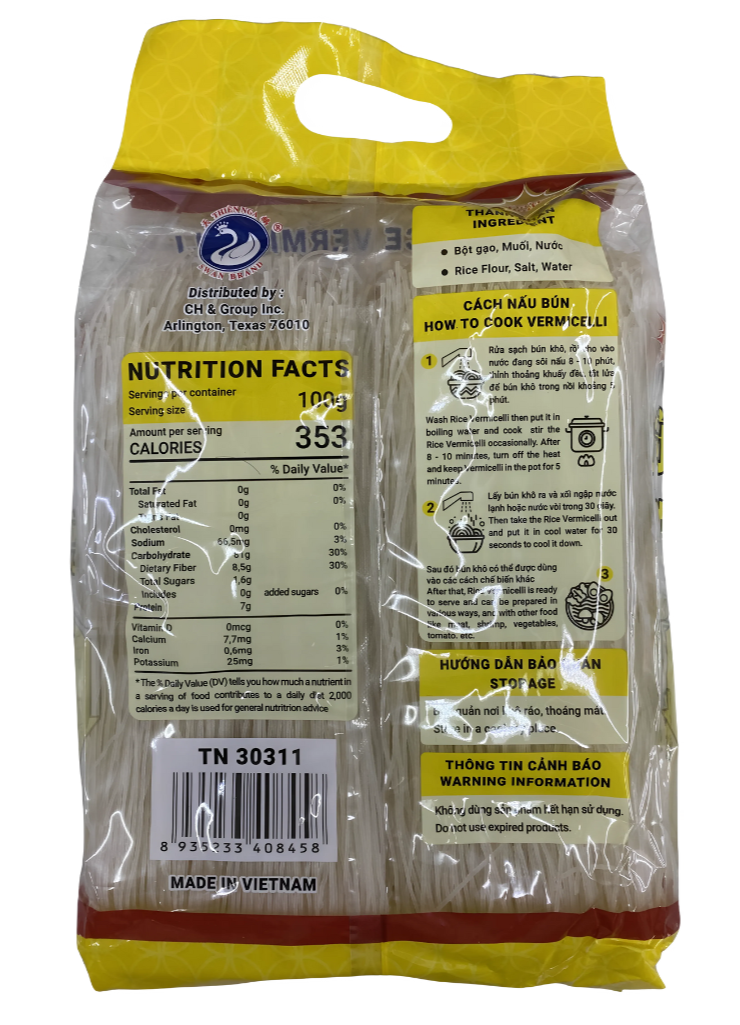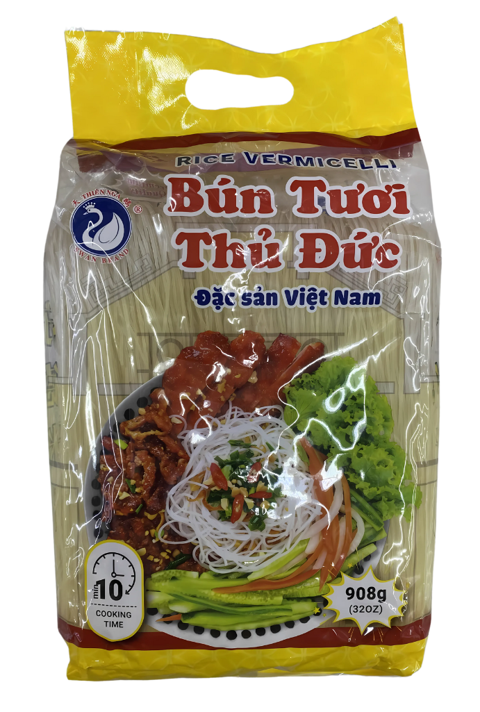 Swan Brand Thu Duc Rice Vermicelli is a popular Vietnamese noodle made from high-quality rice, known for its delicate texture and smooth consistency. It is commonly used in traditional dishes like bánh canh (soup noodles) and bún (noodle bowls) with various toppings such as grilled pork, seafood, or herbs. The vermicelli is easy to cook and absorbs flavors well, making it a versatile ingredient for both casual and festive meals.