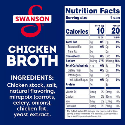 Swanson 100% Natural Gluten-Free Chicken Broth is a wholesome and flavorful broth made from high-quality chicken, with no artificial ingredients or preservatives. This gluten-free option provides a rich, savory taste, perfect for soups, stews, sauces, and more. Ideal for those with gluten sensitivities, it offers a clean, natural flavor to enhance your favorite dishes.
