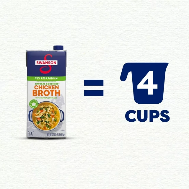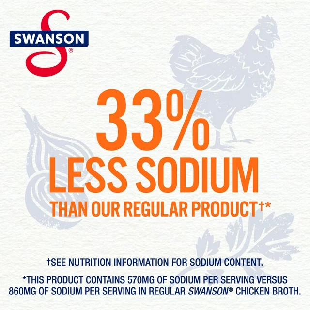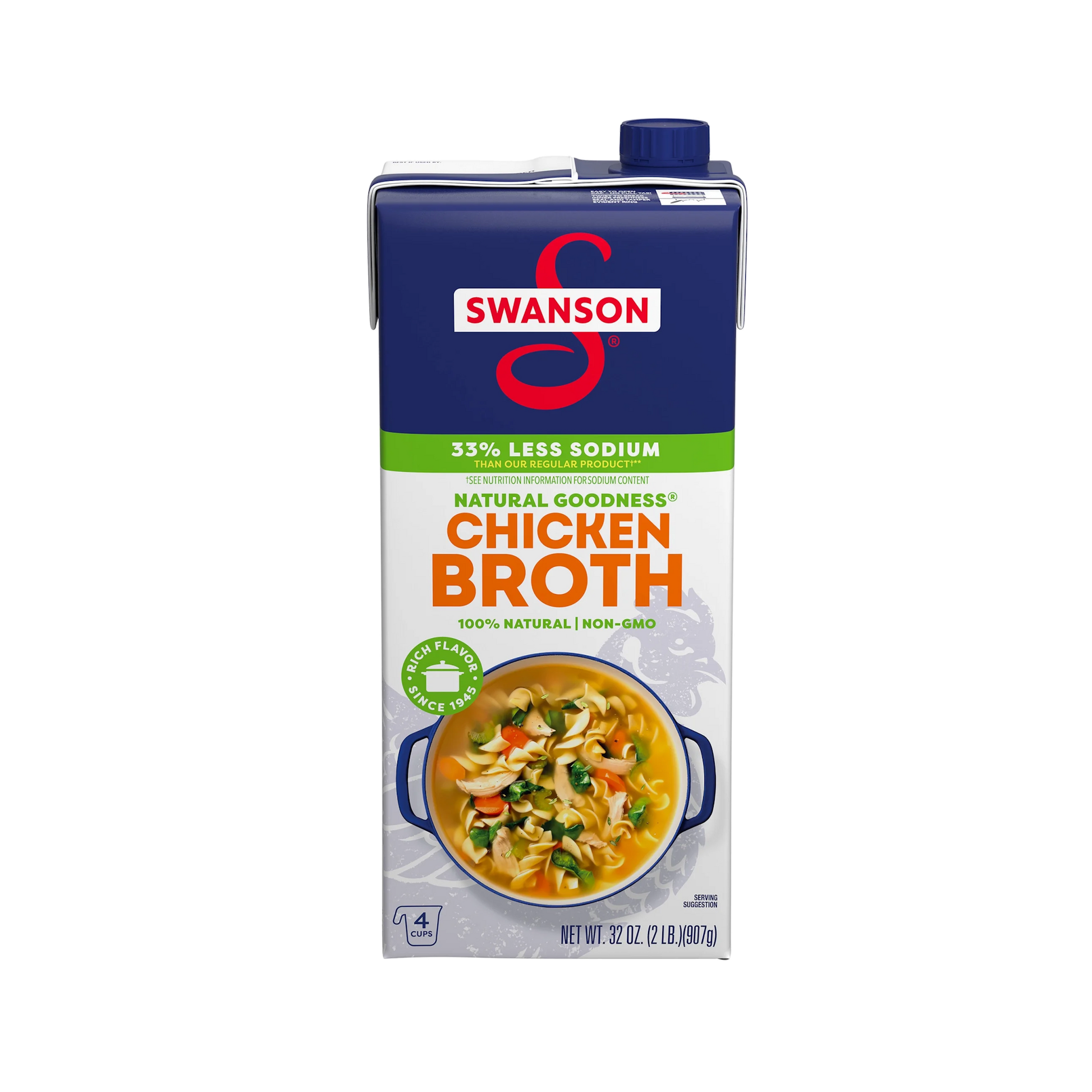 - One 32 ounce carton of Swanson Natural Goodness 33% Less Sodium* Chicken Broth (*Contains 570mg sodium vs. 860mg sodium per 1 cup serving)