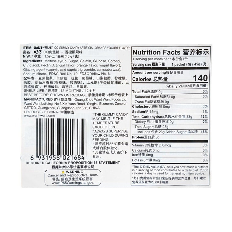 Want-Want Orange Yogurt Gummy is a tasty treat that features a vibrant orange flavor, blending the chewy texture of gummy candy with the creamy goodness of yogurt. It is often shaped in fun designs with bright colors. The gummies deliver a refreshing sweetness balanced with a slight tang from the yogurt, making them a delightful snack. Loved for their delicious taste and chewy consistency, these gummies are perfect for a quick snack or a light dessert anytime you want something fruity and satisfying!